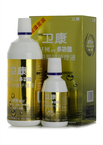 卫康卫视多功能护理液—金装用于清除蛋白,清洁,冲洗,消毒,储存,润滑。双胍(polyaminopropy I biguanide)有效杀灭各种细菌和真菌,且温和不刺激,倍感舒适。清爽、晶莹更透亮、对眼睛没刺激!感觉真的舒服!适用于各种品牌隐形眼镜。